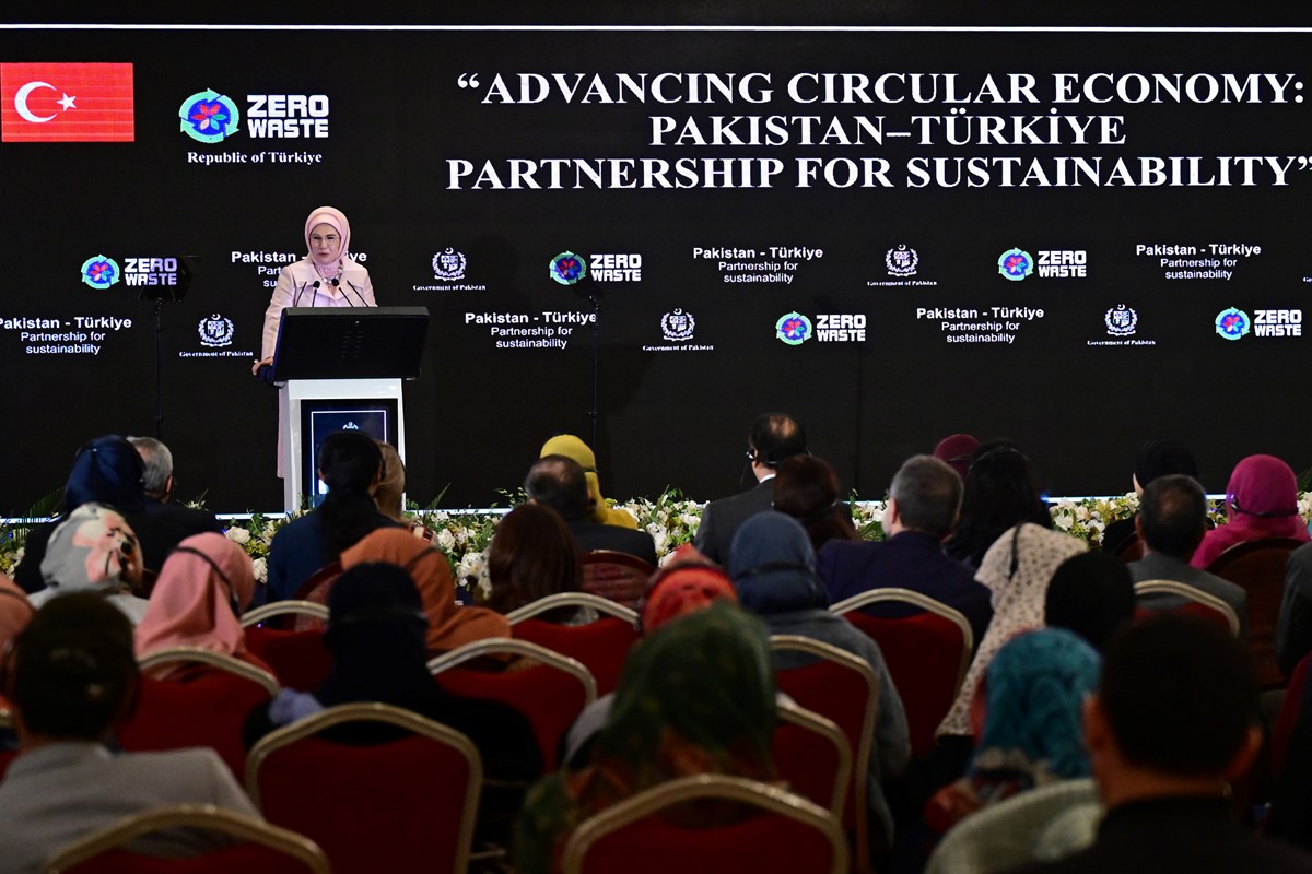 Cumhurbaşkanı Recep Tayyip Erdoğan’ın eşi Emine Erdoğan, her alanda ekolojik dengeyi yeniden tesis edecek politikalar geliştirilmesi gerektiğini söyledi. “Yapılacaklar listemizin en başında, döngüsel ekonomiyi bir an önce hayata geçirmek yer alıyor.” diyen Erdoğan, Sıfır Atık Vakfı’nın küresel girişimler için çatı olmayı sürdürdüğünü ifade etti.Resmi temaslarda bulunmak üzere Pakistan'ın başkenti İslamabad'a gelen Cumhurbaşkanı Recep Tayyip Erdoğan'a eşlik eden eşi Emine Erdoğan, "Döngüsel Ekonominin İlerletilmesi: Sürdürülebilirlik İçin Pakistan-Türkiye Ortaklığı" etkinliğine katıldı. Eski Pakistan Başbakanı Navaz Şerif'in kızı ve Pencap Eyaleti Başbakanı Meryem Navaz Şerif'in ev sahipliğinde düzenlenen programda, Kur'an-ı Kerim okunmasının ardından İstiklal Marşı ve Pakistan Milli Marşı okundu. Emine Erdoğan, programda yaptığı konuşmada, Cumhurbaşkanı Erdoğan'ın da her zaman söylediği gibi bugün yabancı bir ülkede değil, kendi evlerinde olduklarını belirterek Türkiye ve Pakistan'ın birbirine sapasağlam kardeşlik bağlarıyla bağlı olduğunu ifade etti. Pakistan denilince akıllara vefa ve kara gün dostluğunun geldiğini belirten Emine Erdoğan, kalpleri birbiri için atan iki ülke ve iki millet olarak tarihe üstün fedakarlık örnekleri bıraktıklarını dile getirdi. İki ülke arasındaki bu köklü ve nadide dostluğun, savaşlarla dolu dünyaya da bir esin kaynağı olması temennisinde bulunan Emine Erdoğan, "Dönüşümsel Ekonomi ve Sıfır Atık" temasıyla düzenlenen etkinlikte olmaktan duyduğu memnuniyeti ifade etti.