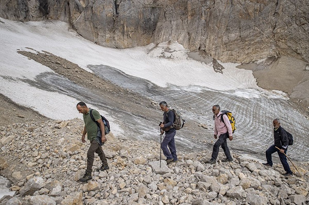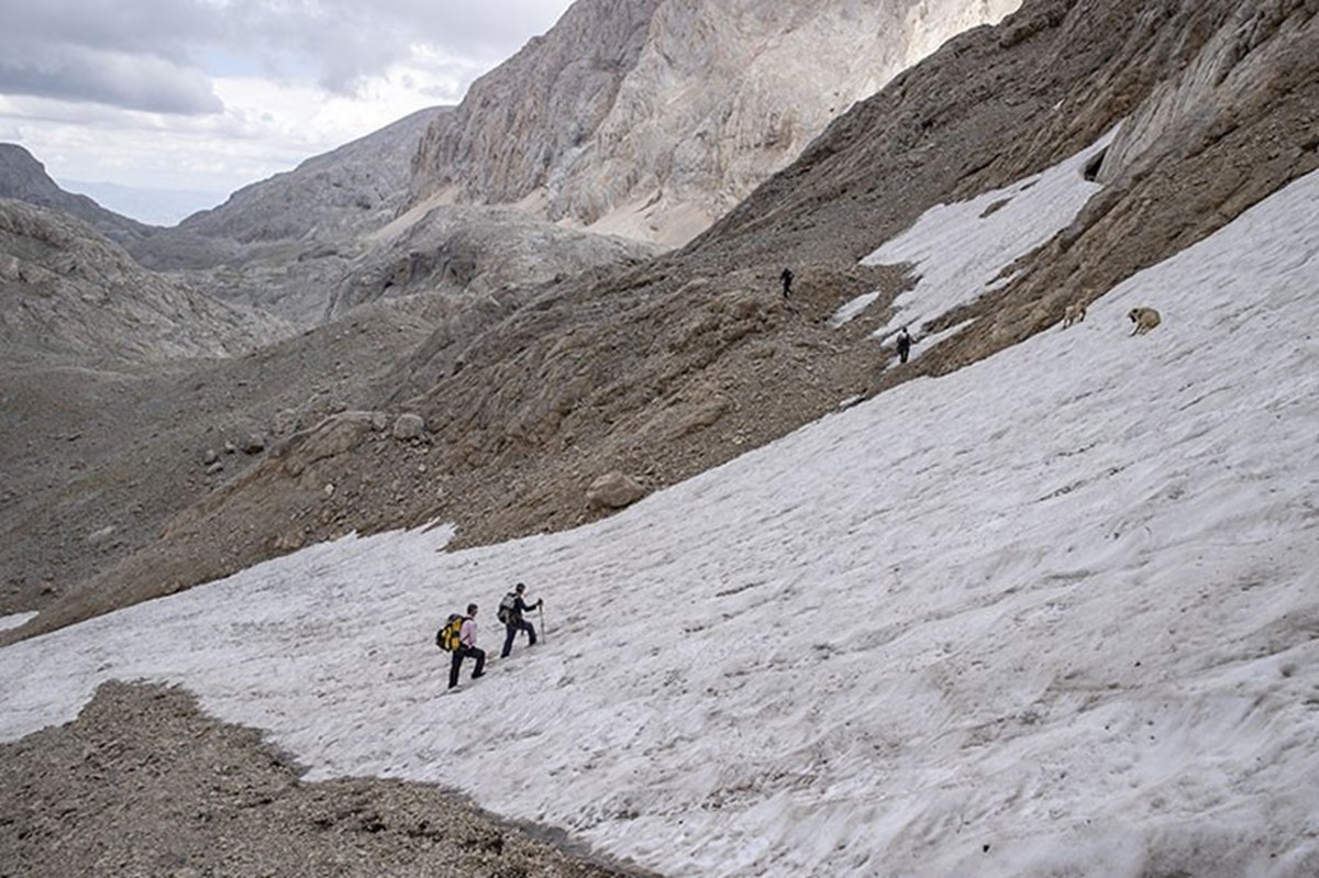 Kar ve bahar manzaralarını da aynı kadrajda gören doğa tutkunları, yaklaşık 9 saatlik tırmanışın sonunda 3310 metre yükseklikteki Şahintaşı Buzulu'na varıyor. Bölgedeki yaylalarda vakit geçiren doğaseverler, buzul üzerindeki farklı yıllara ait birikimi yansıtan oluşumları ve kayaçları fotoğraflıyor.